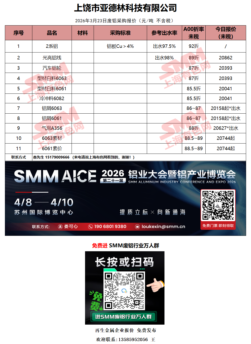 3月23日上饶市亚德林 废铝采购报价