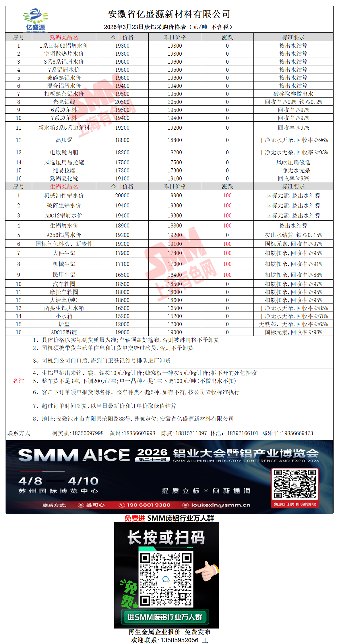 3月23日上海沪闽&福建沪鑫 废铝采购报价