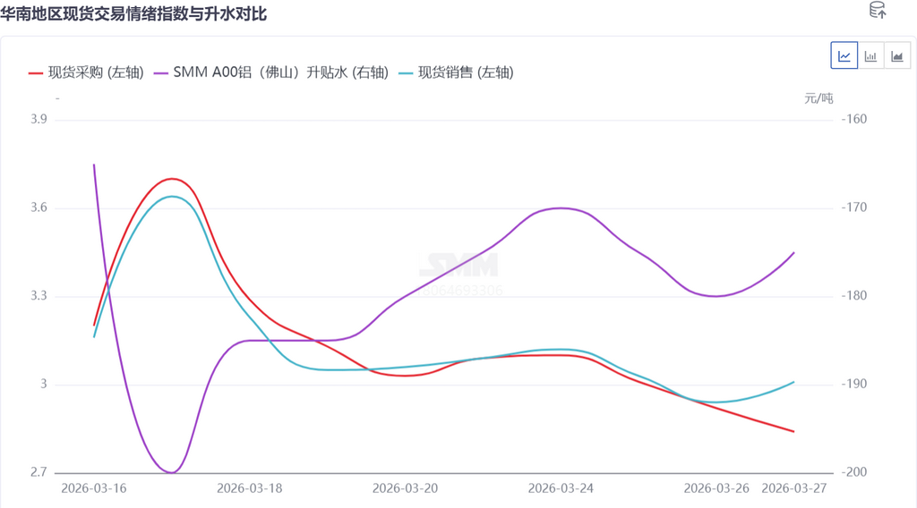 本周华南现货市场交投情绪整体趋稳,并未因库存大幅增加陷入全面低迷。持货商挺价惜售情绪较浓,不愿低价出货;下游加工厂逢低价采购补库的积极性较高,刚需拿货支撑现货成交。但受周内库存大幅累库、流通货源宽松的影响,贸易商压价接货、交单成交相对有限,现货贴水虽小幅收窄,但依旧处于高位,现货价格上行乏力,与华东市场的价差持续拉大。