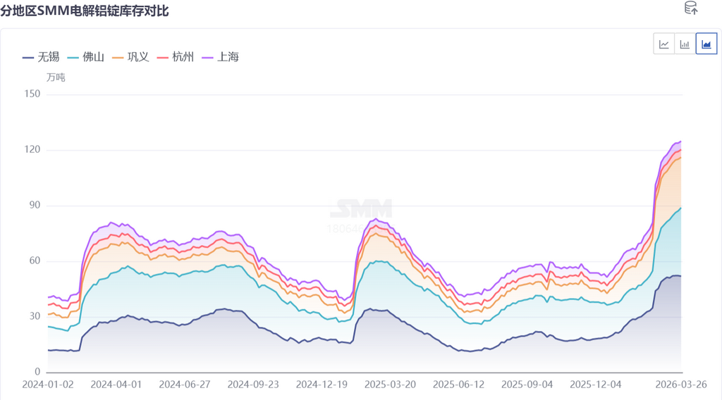 云南、广西作为国内电解铝主产区,步入三月下半月,部分铝厂开启厂内库存集中发运模式,前期积压在厂区的货源批量运往华南消费地仓库入库。华南地区本身是铝锭核心消费区域,周边产区货源就近流入,叠加产区集中发货,短时间内大量货源涌入华南市场,远超当地当下的现货消化速度,直接推高社会库存,是导致华南库存异动的直接原因。