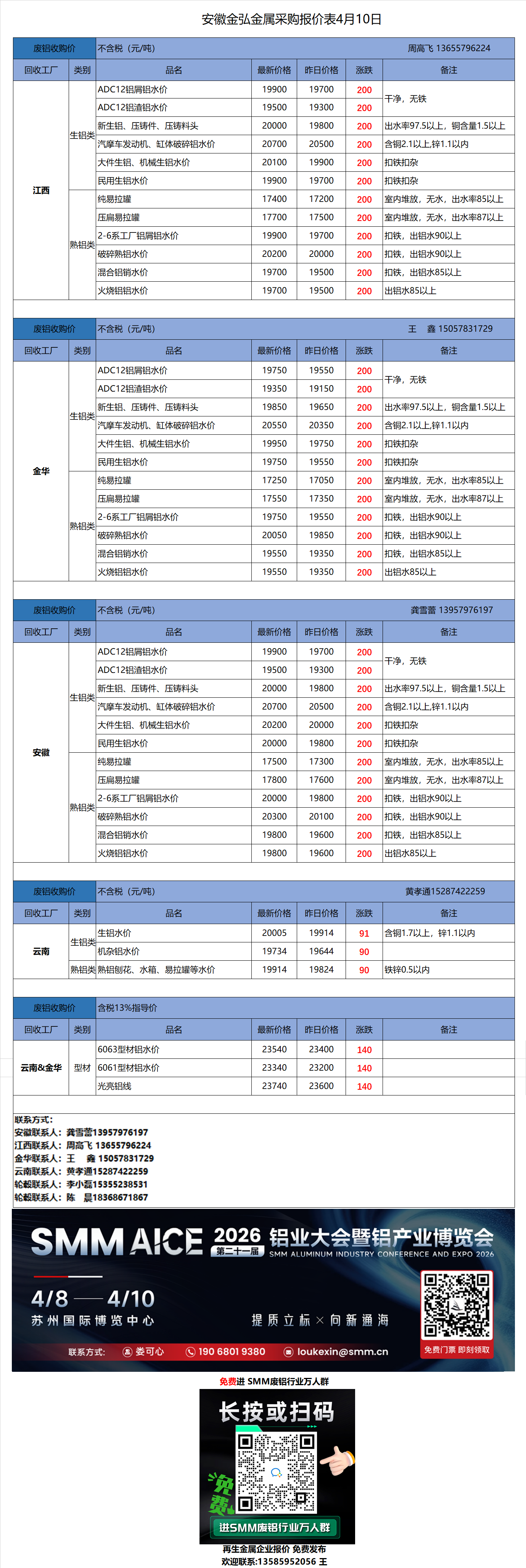 今日安徽金弘 废铝采购报价已更新,有货的朋友欢迎联系我们!