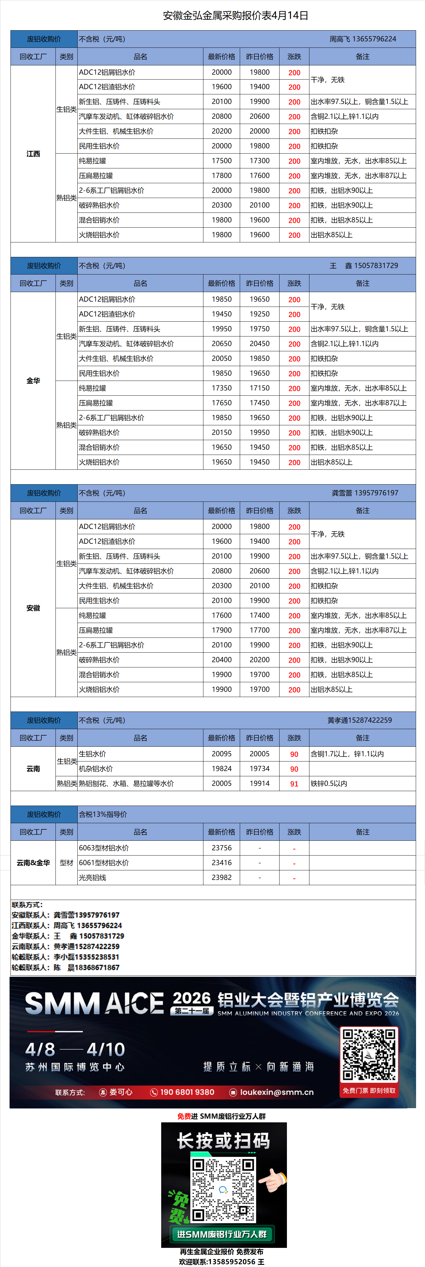 4月14日安徽金弘 废铝采购报价
