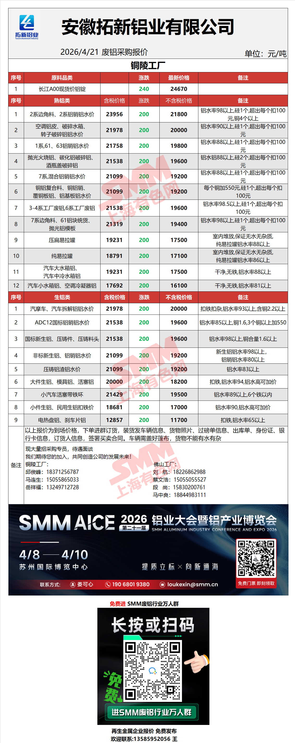 4月21日拓新铝业 废铝采购报价