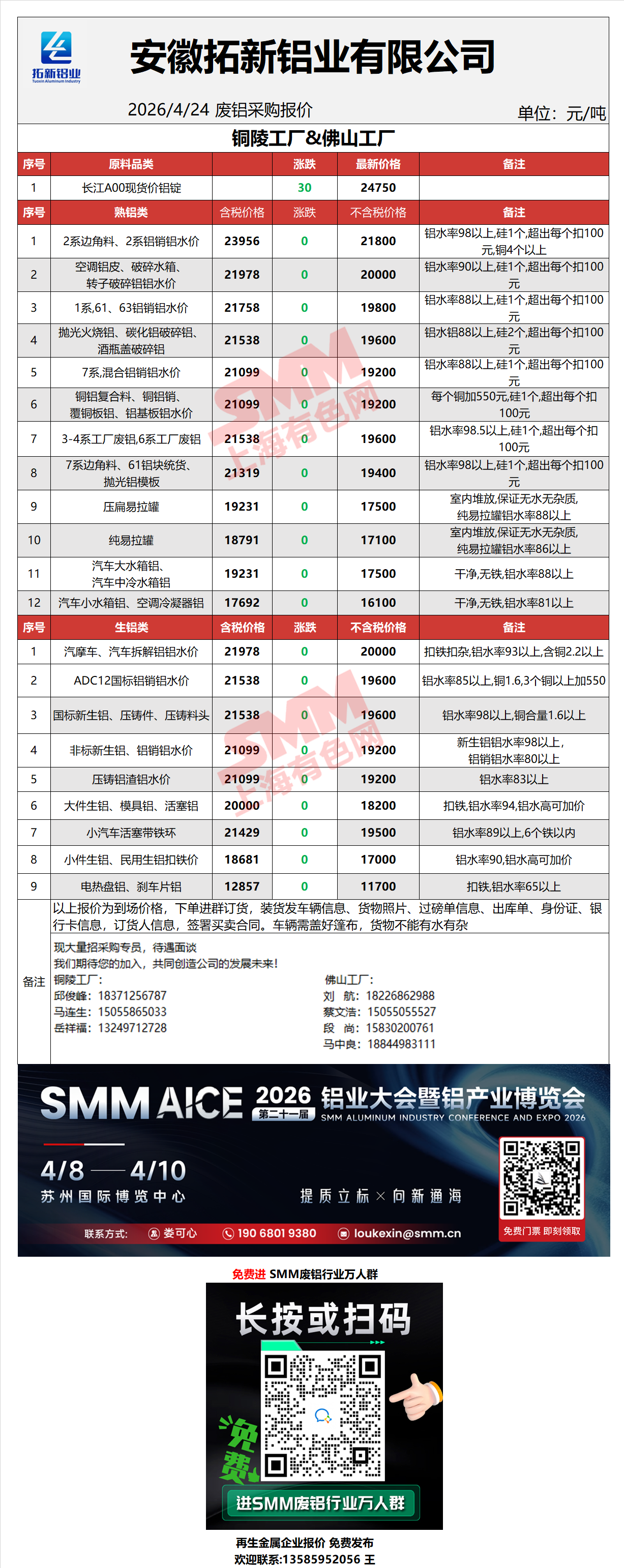 4月24日拓新铝业 废铝采购报价