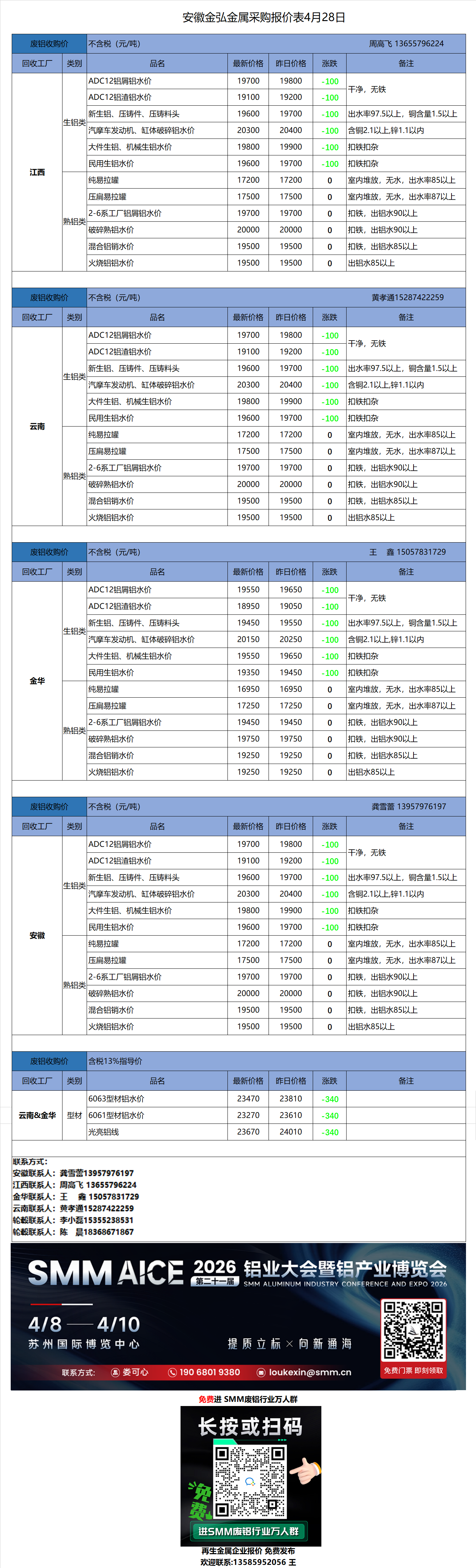 今日安徽金弘 废铝采购报价已更新,有货的朋友欢迎联系我们!