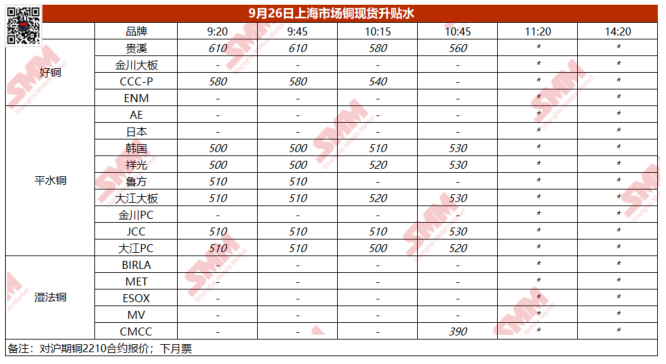 9月26日上海市场铜现货升贴水(第四时段)【SMM价格】