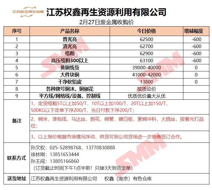 2月27日江苏权鑫 废金属收购报价