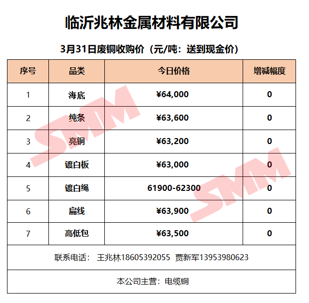 3月31日临沂兆林金属 废铜收购报价