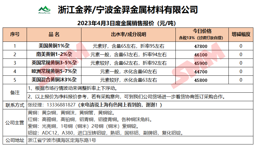 4月3日浙江金荞/宁波金羿 废铜销售报价