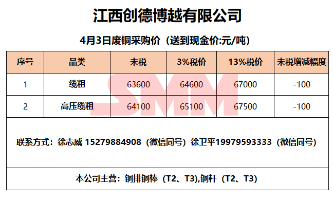4月3日江西创德博越 废铜采购报价