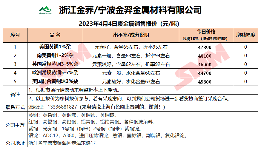 4月4日浙江金荞/宁波金羿 废铜销售报价