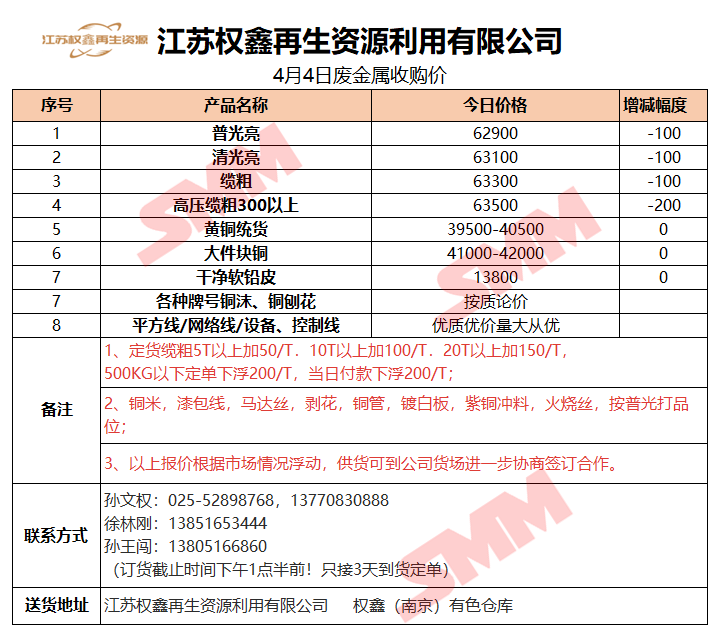 今日江苏权鑫再生资源利用有限公司 废金属收购报价已更新,有货的朋友欢迎联系我们!