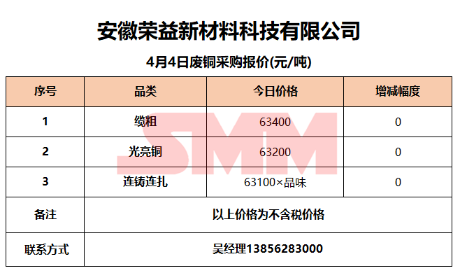 4月4日安徽荣益 废铜采购报价