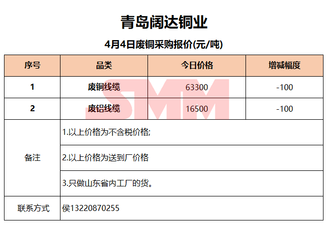 4月4日青岛阔达 废铜采购报价