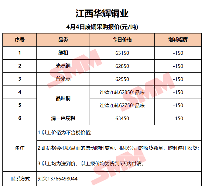 4月4日江西华辉铜业 废铜采购报价