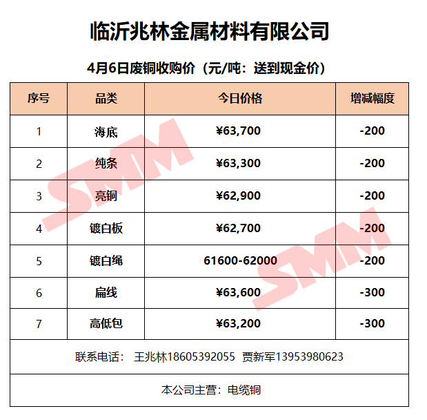 4月6日临沂兆林金属 废铜收购报价