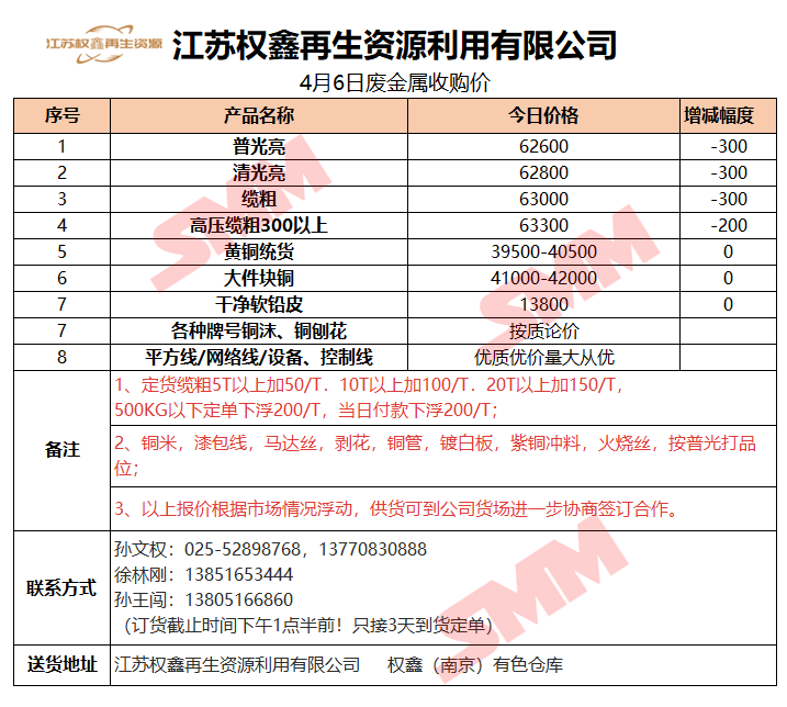 4月6日江苏权鑫 废金属收购报价