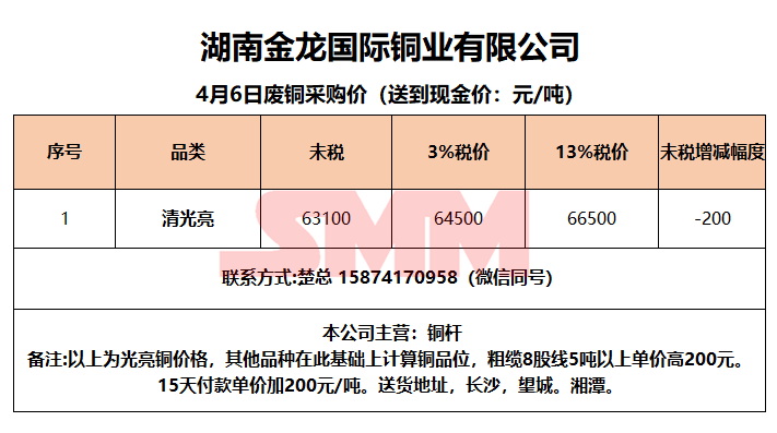 4月6日湖南金龙 废铜采购报价