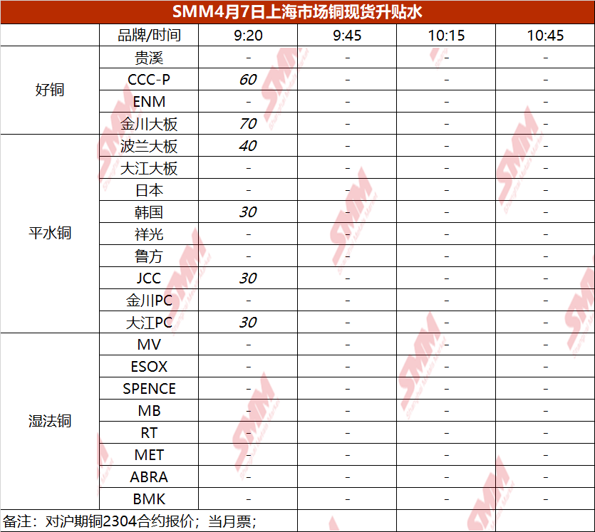 4月7日上海市场铜现货升贴水(第一时段)【SMM价格】