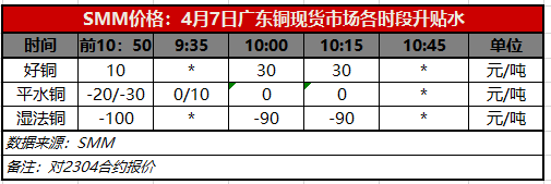 4月7日广东铜现货市场各时段升贴水(第三时段10:15)【SMM价格】