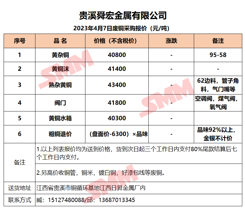 4月7日贵溪舜宏 废铜采购报价