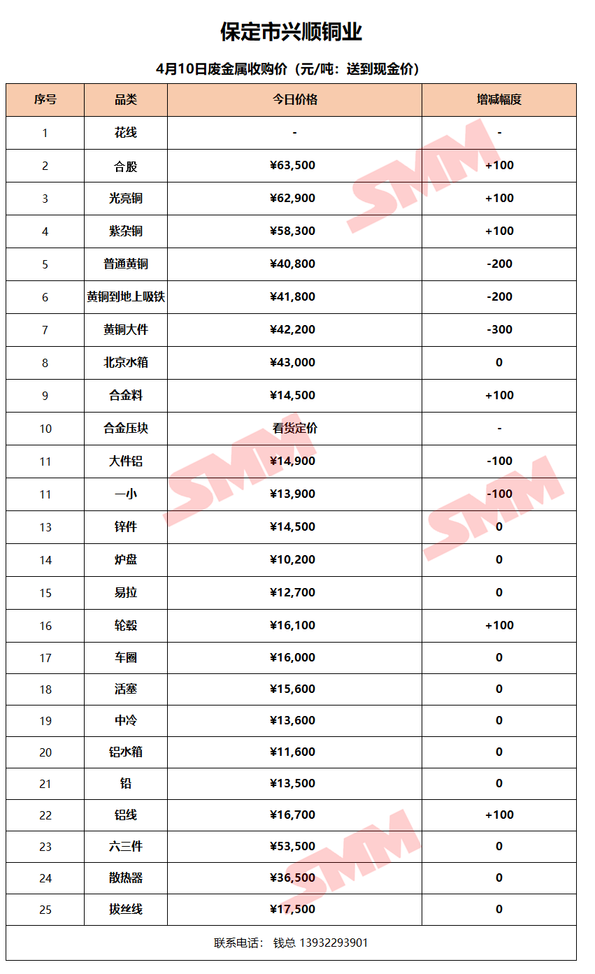 今日保定兴顺铜业,废金属收购报价已更新,有货的朋友欢迎联系我们!