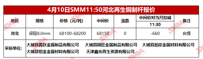 4月10日SMM河北地区再生铜制杆报价