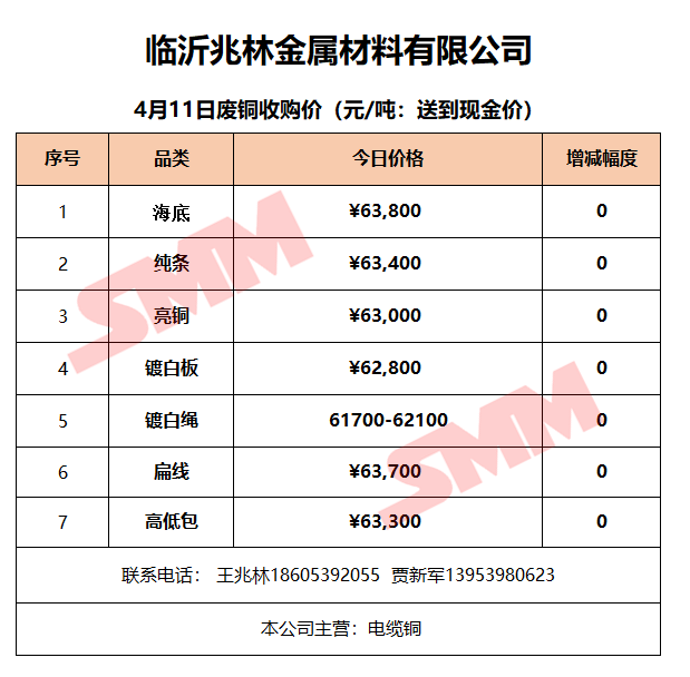 4月11日临沂兆林金属 废铜收购报价