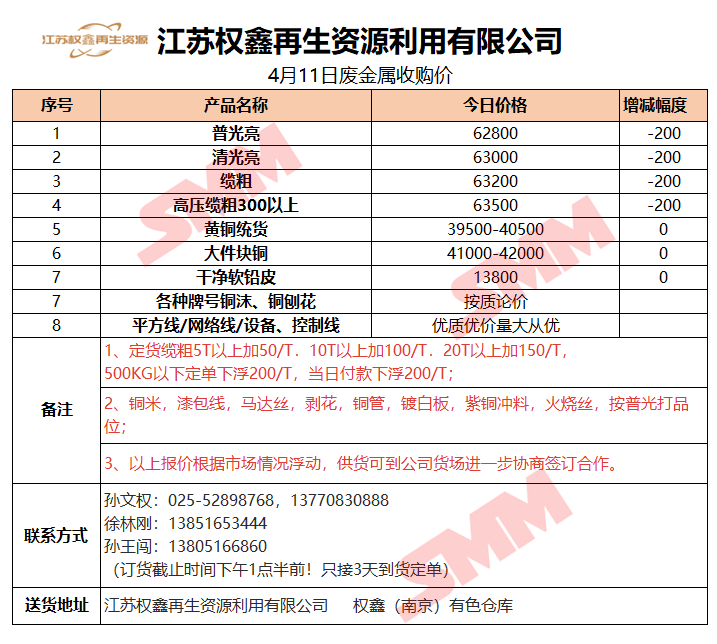 4月11日江苏权鑫 废金属收购报价