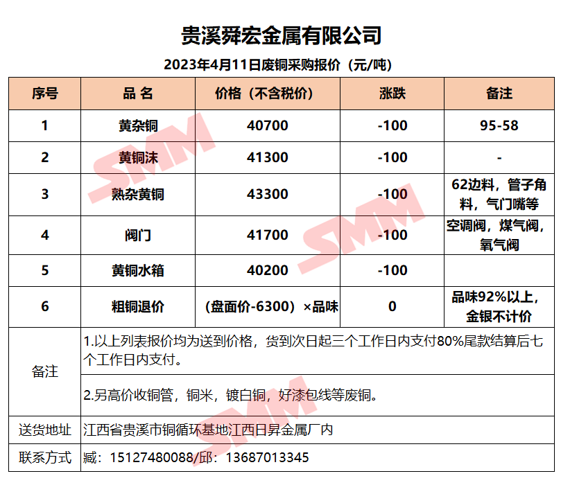 4月11日贵溪舜宏 废铜采购报价