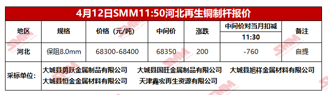 4月12日SMM河北地区再生铜制杆报价