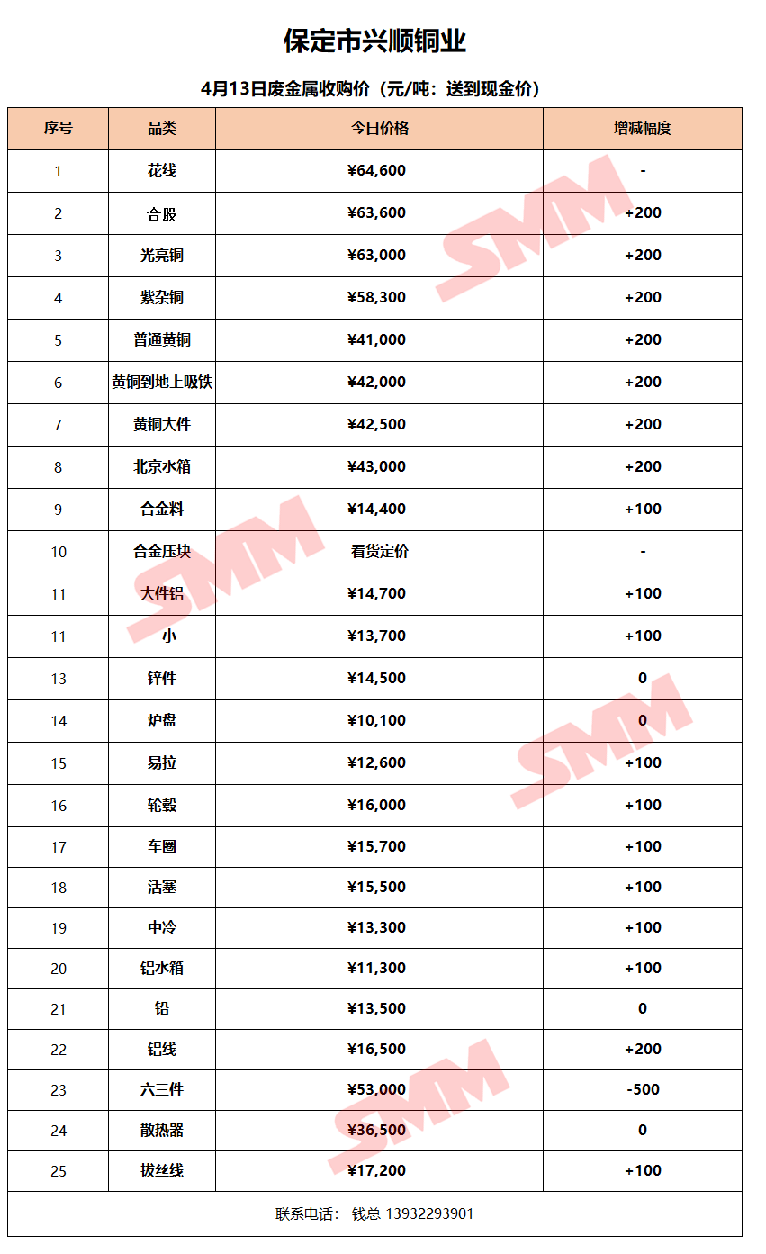 4月13日保定兴顺铜业 废金属收购报价