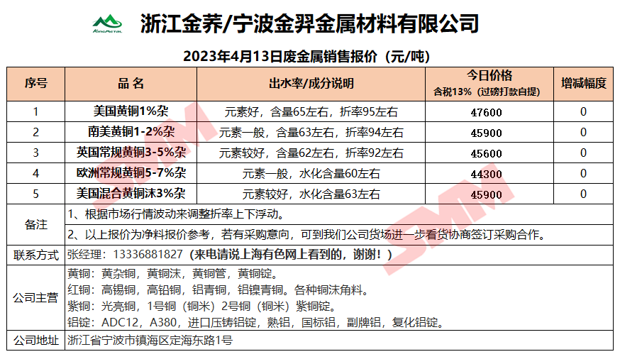 4月13日浙江金荞/宁波金羿 废铜销售报价