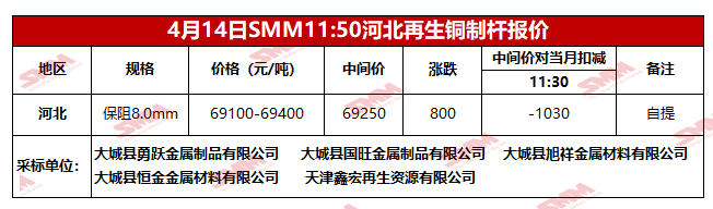4月14日SMM河北地区再生铜制杆报价
