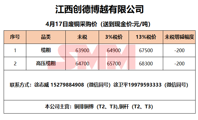 今日江西创德博越,废铜采购报价已更新,有货的朋友欢迎联系我们!