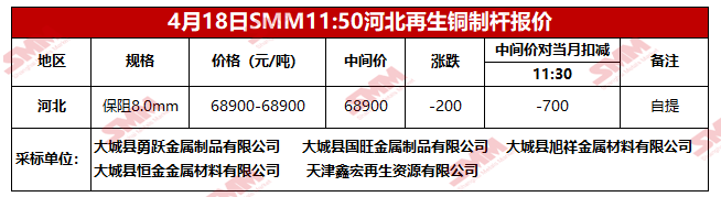 4月18日SMM河北地区再生铜制杆报价
