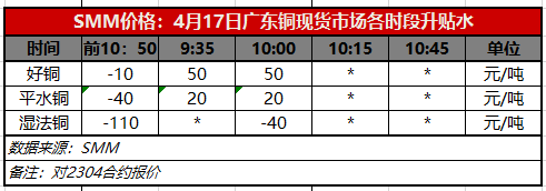 4月17日广东铜现货市场各时段升贴水(第二时段10:00)【SMM价格】
