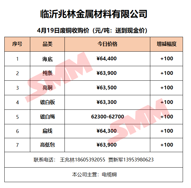 4月19日临沂兆林金属 废铜收购报价