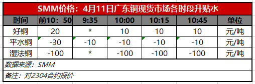 4月11日广东铜现货市场各时段升贴水(第四时段10:45)【SMM价格】