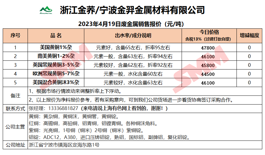 4月19日浙江金荞/宁波金羿 废铜销售报价