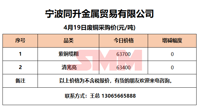 4月19日同升金属 废铜采购报价