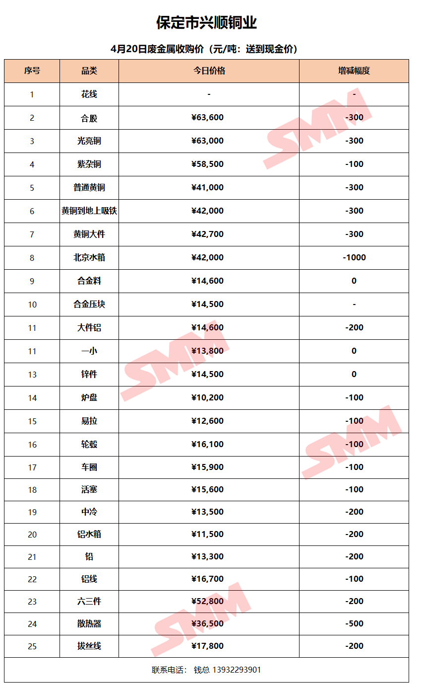 4月20日保定兴顺铜业 废金属收购报价