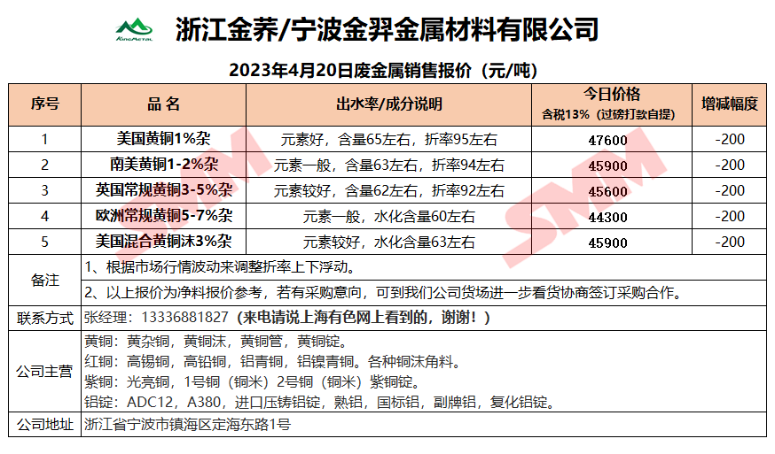 4月20日浙江金荞/宁波金羿 废铜销售报价