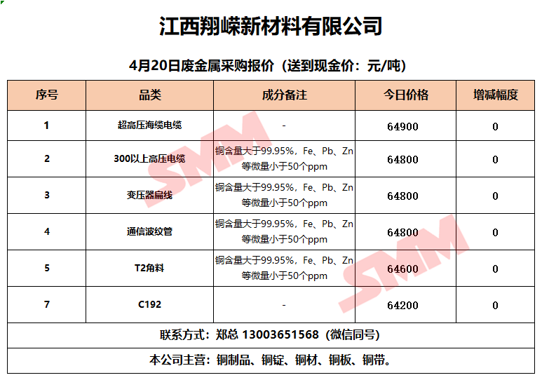 4月20日江西翔嵘新材料 废铜采购报价