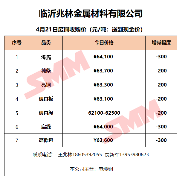 4月21日临沂兆林金属 废铜收购报价