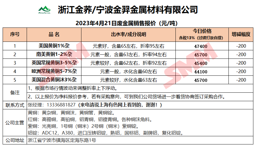 4月21日浙江金荞/宁波金羿 废铜销售报价