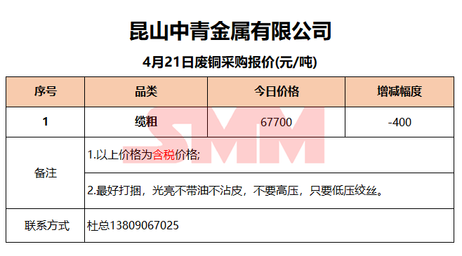 4月21日昆山中青 废铜采购报价