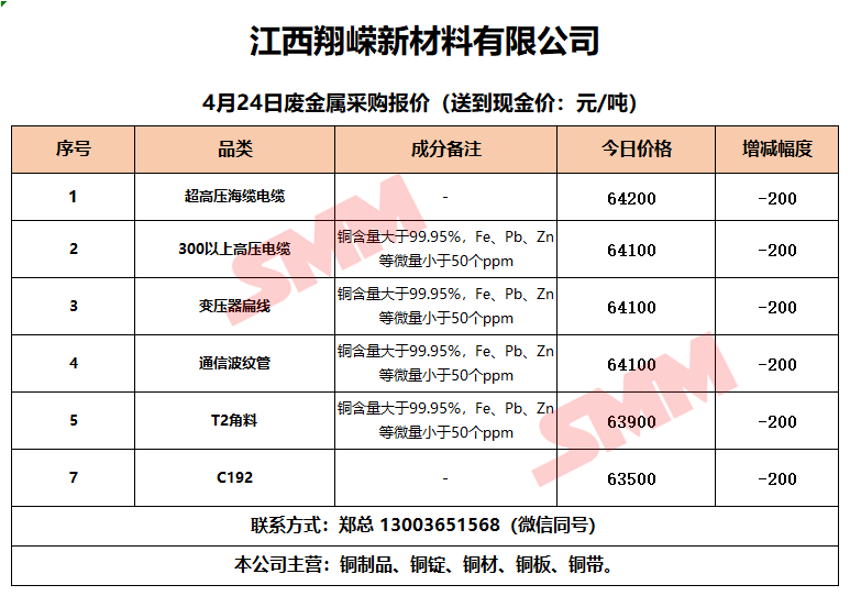 4月24日江西翔嵘新材料 废铜采购报价