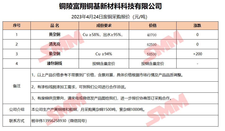 4月24日铜陵富翔 废铜采购报价