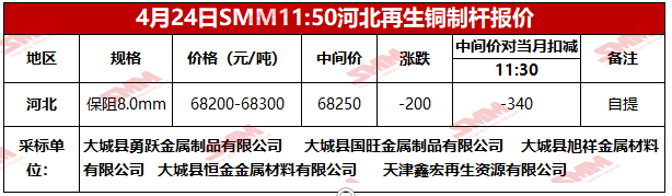 4月24日SMM河北地区再生铜制杆报价